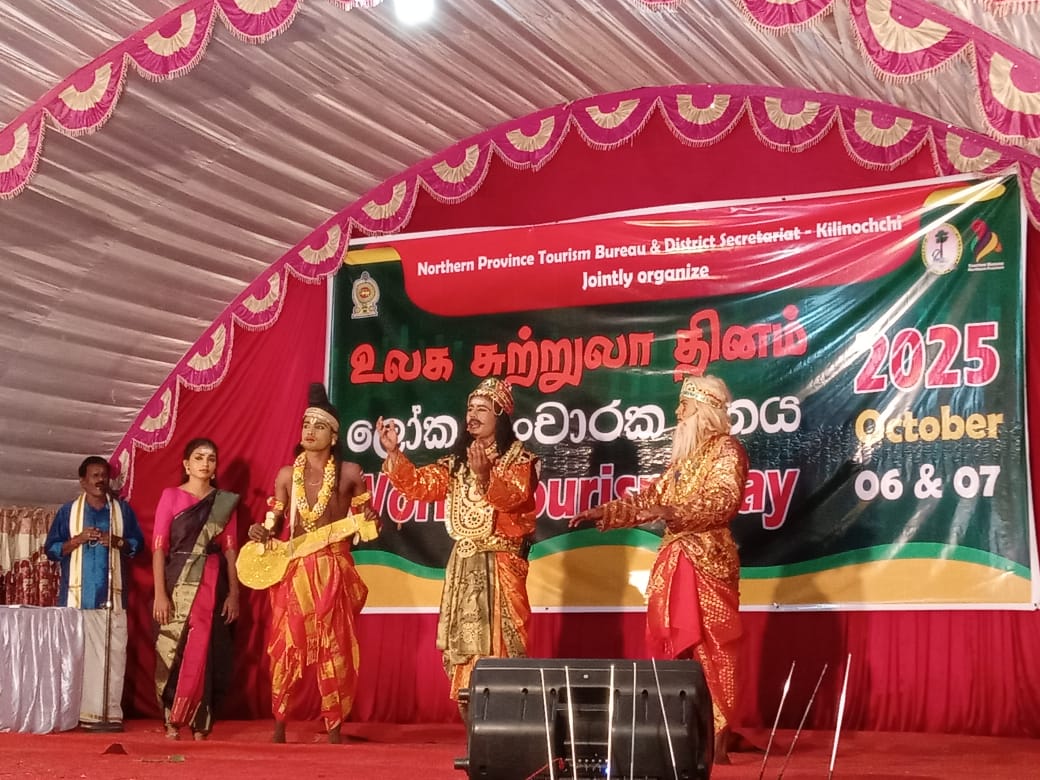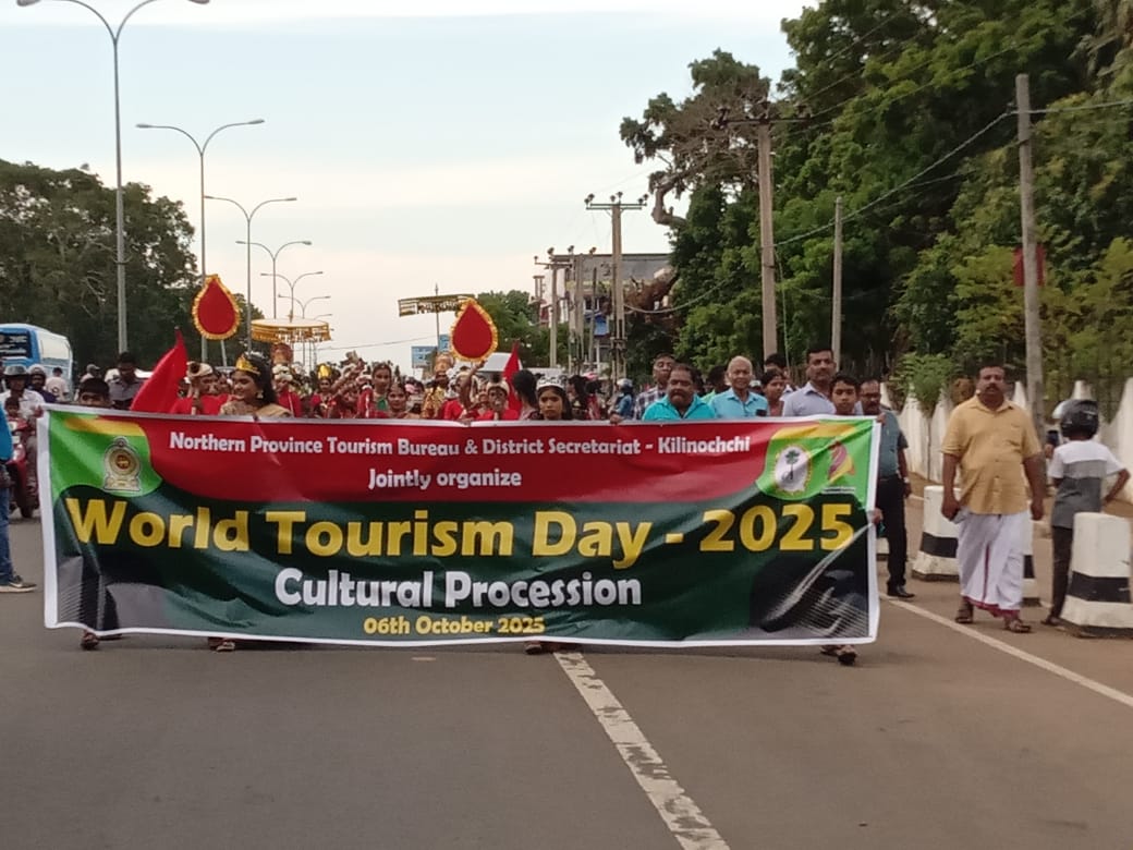 In celebration of World Tourism Day, the Northern Province Tourism Bureau, in collaboration with the District Secretariat – Kilinochchi, successfully organized a two-day programme in Kilinochchi on 06th and 07th October 2025. The inaugural day commenced with a vibrant cultural procession, which began at the Old Kachcheri premises and concluded at Green Park, Kilinochchi. The cultural procession was led by the Chairman of the Northern Province Tourism Bureau, Mr.A.Pathinathan. The procession featured a variety of cultural and traditional performances, showcasing the rich heritage and artistic talent of the region.